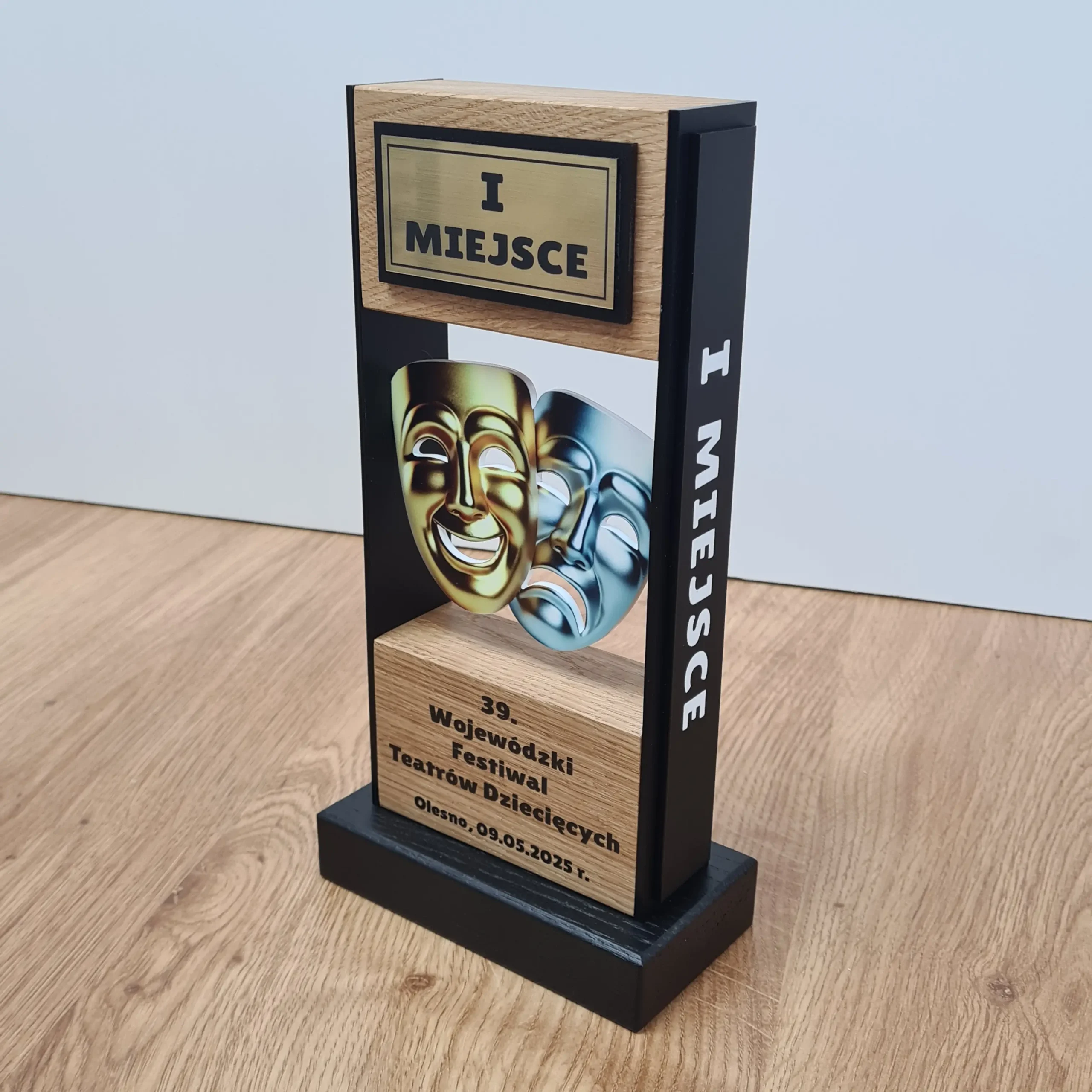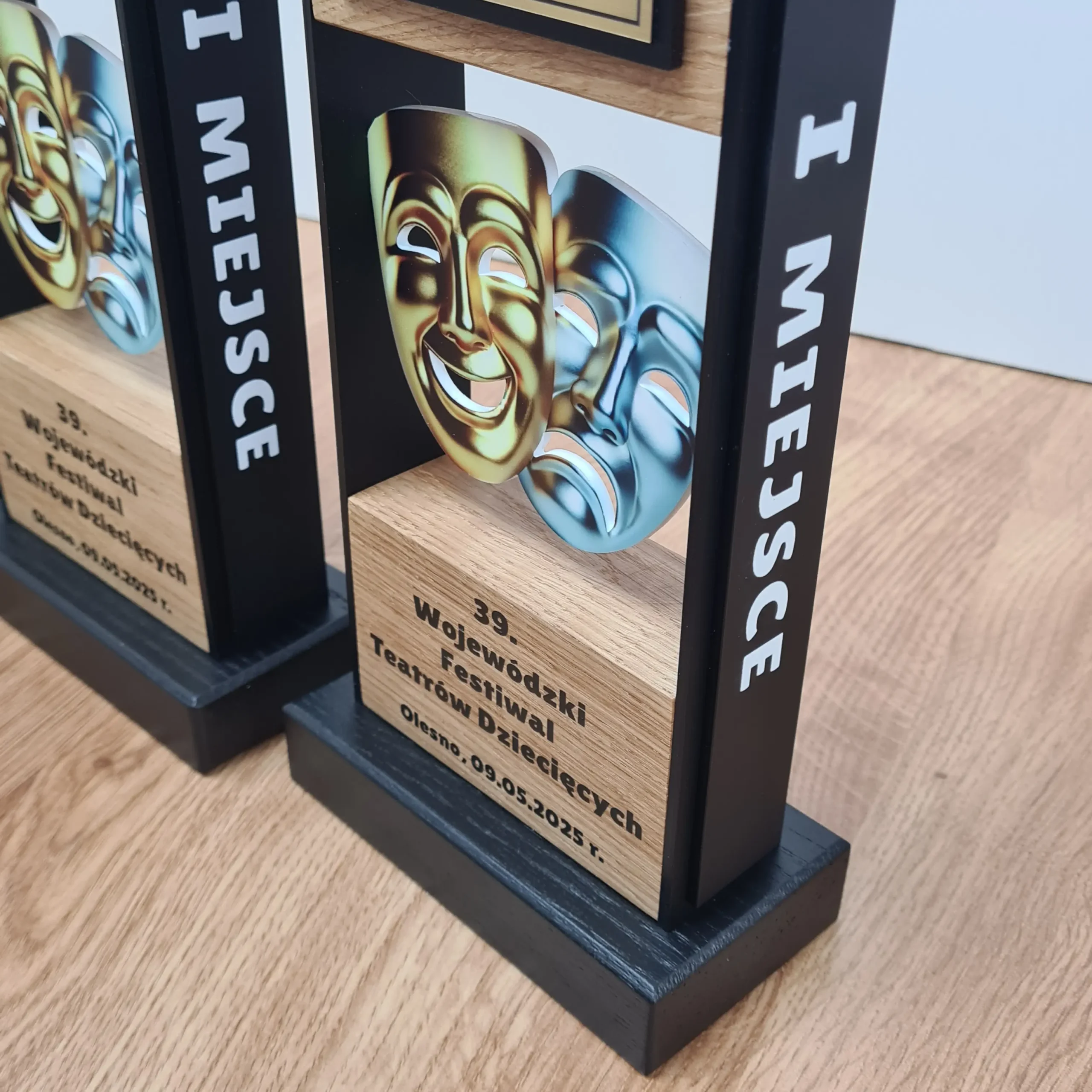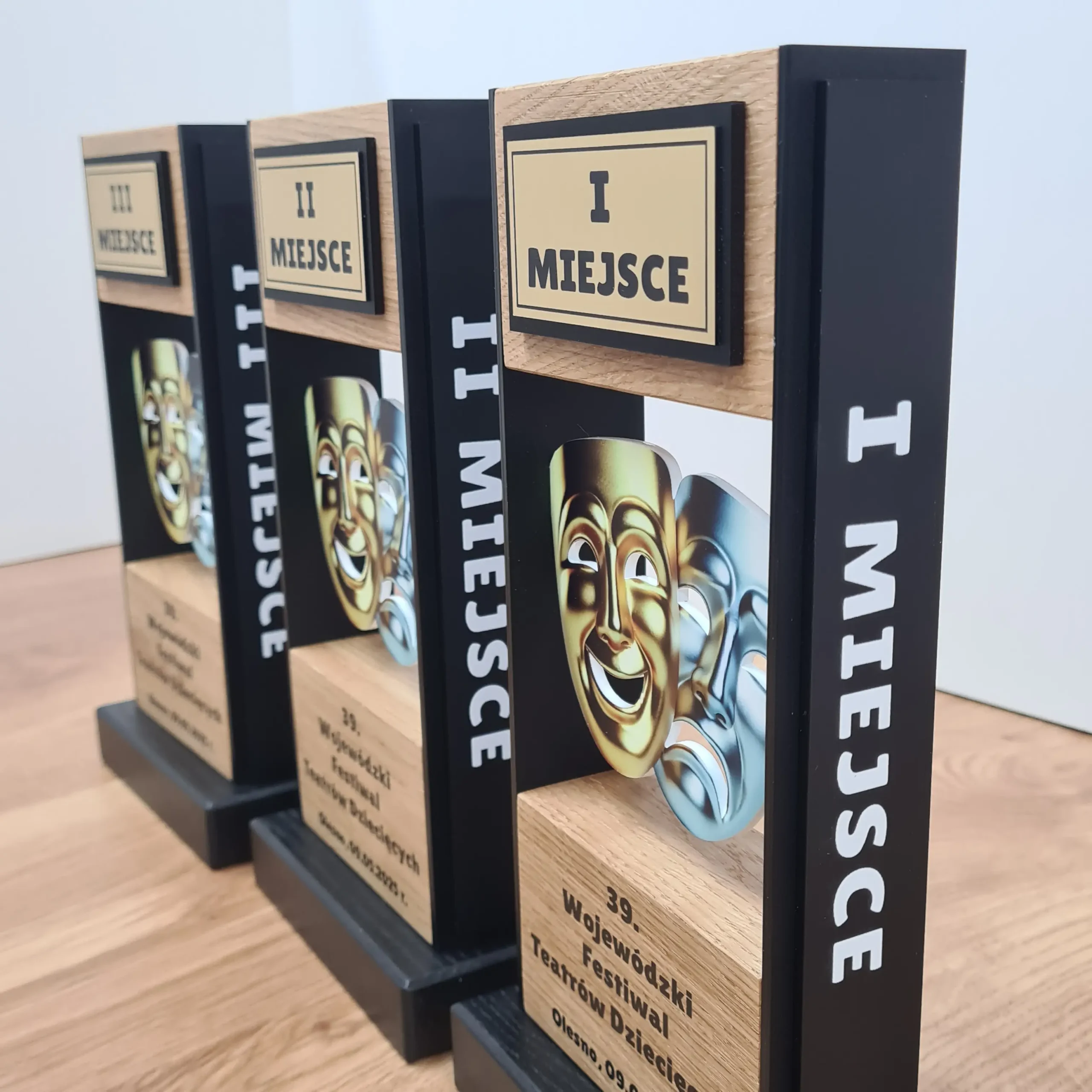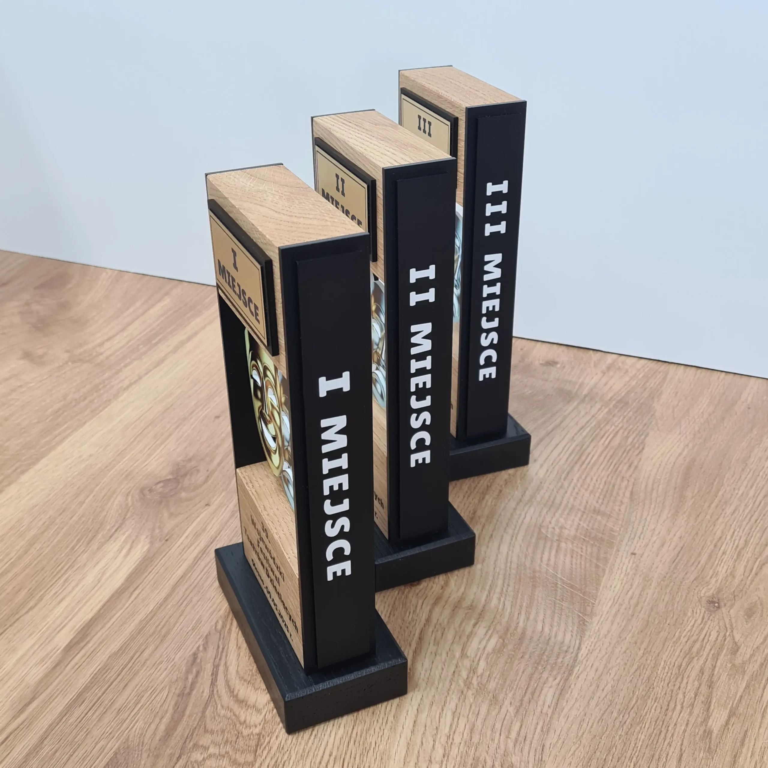 Eleganckie i nowoczesne statuetki wykonane z naturalnego drewna dębowego w połączeniu z czarnymi  matowymi elementami.