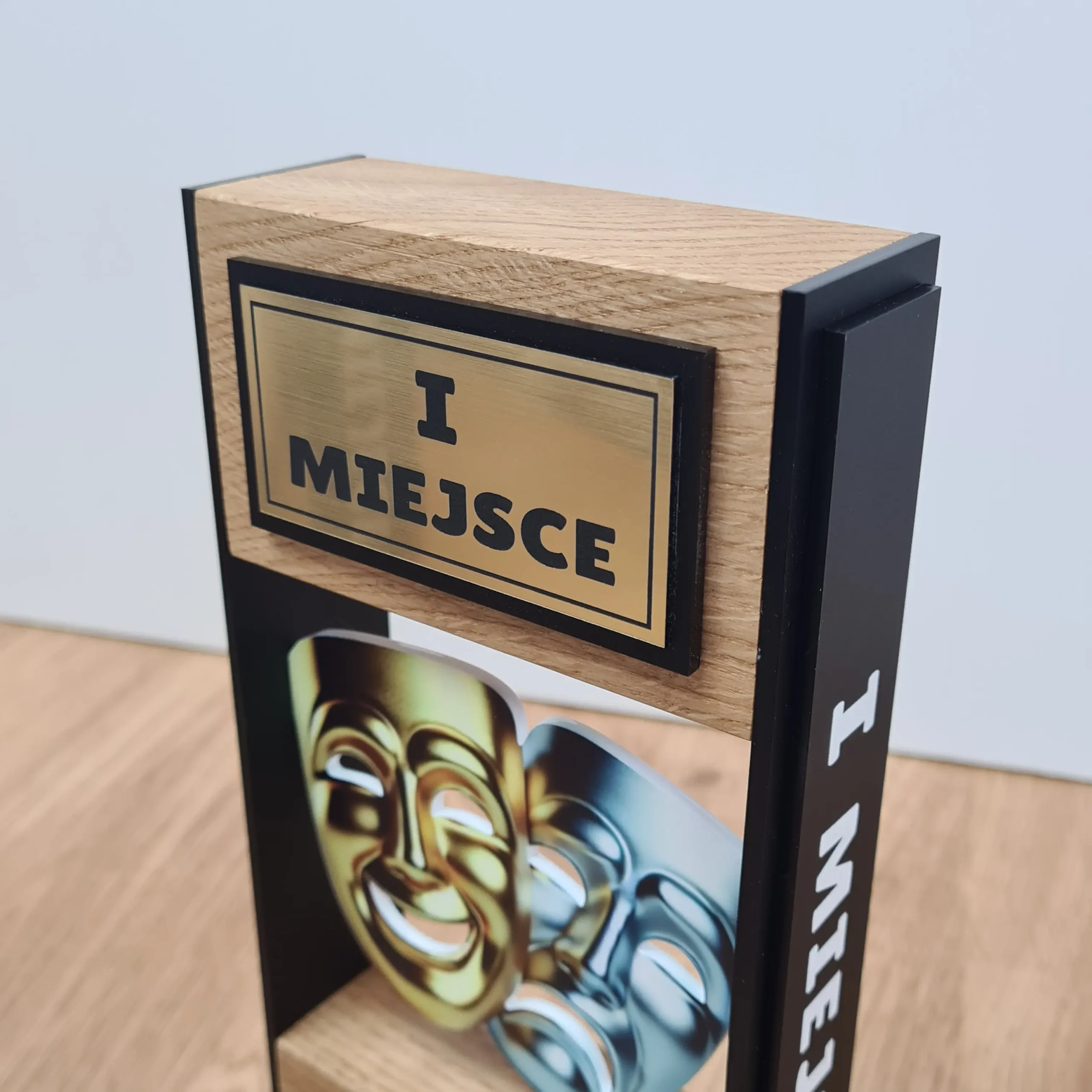 Motyw masek teatralnych w złotym i srebrnym wykończeniu, naniesiony trwałym nadrukiem UV, symbolizuje sztukę sceniczną, emocje i kreatywność.