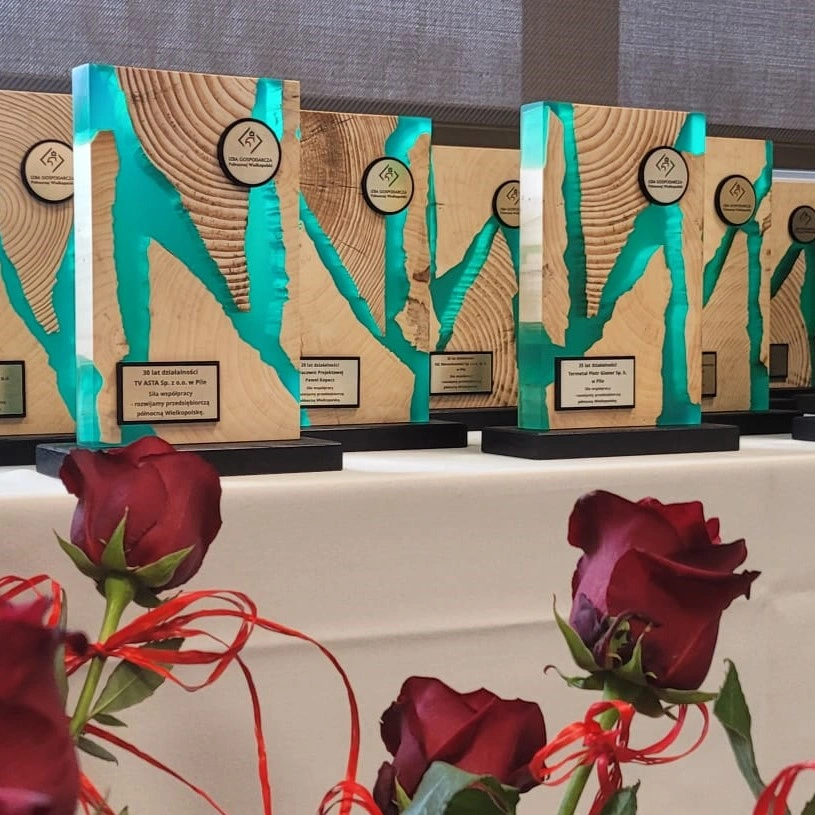 Statuetki wykonane z naturalnego drewna i żywicy epoksydowej w intensywnym turkusowym kolorze. Każda z nich jest podobna, ale nie identyczna – unikalne układy słojów i naturalnych pęknięć w drewnie sprawiają, że każdy przedsiębiorca otrzyma swój jedyny w swoim rodzaju egzemplarz. Złote tabliczki oraz czarna podstawa dodają prestiżu i nowoczesnego charakteru.