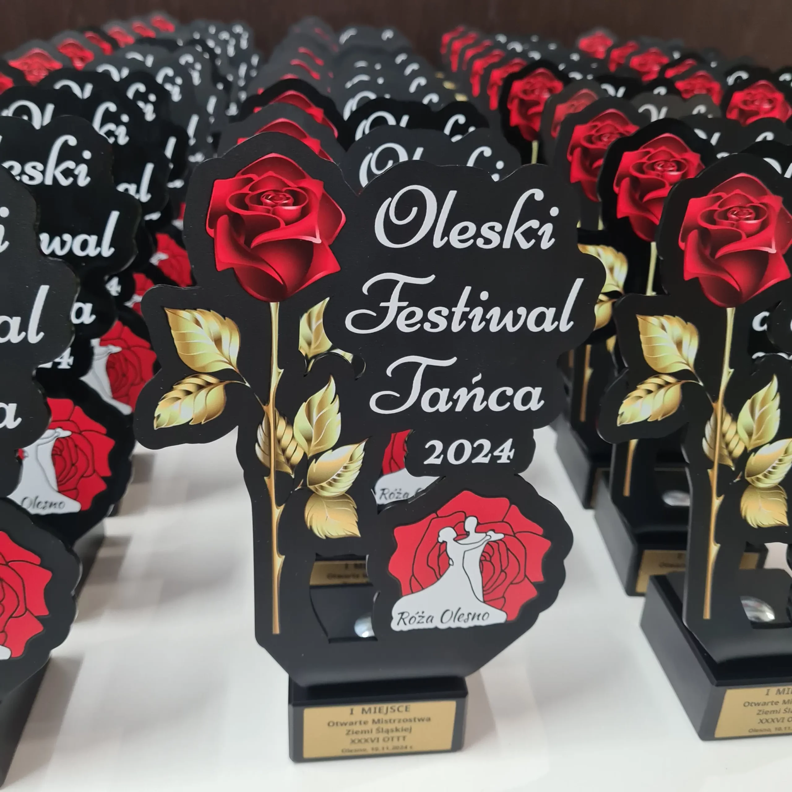 Eleganckie, personalizowane statuetki wykonane z czarnego plexi z nadrukiem UV. Motywem przewodnim jest czerwona róża, symbolizująca pasję i piękno tańca. Złote akcenty oraz subtelne detale nadają całości wyjątkowy charakter.