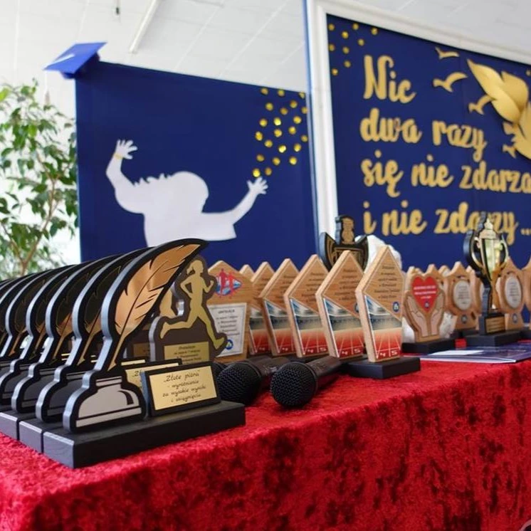 Zestaw statuetek wykonany dla jednej ze szkół na zakończenie roku szkolnego. Statuetki zostały dostosowane do kategorii, w której uczniowie otrzymywali nagrody.