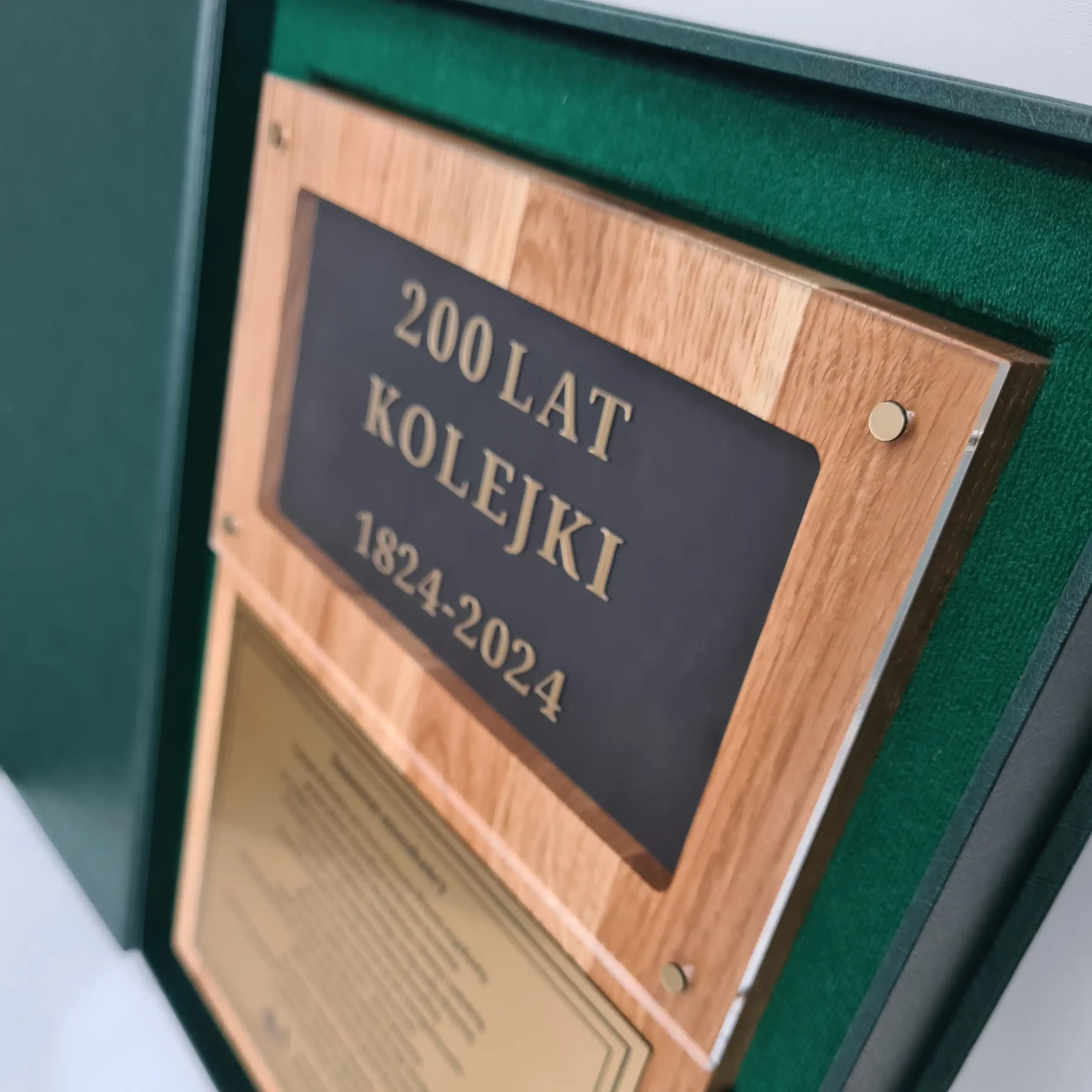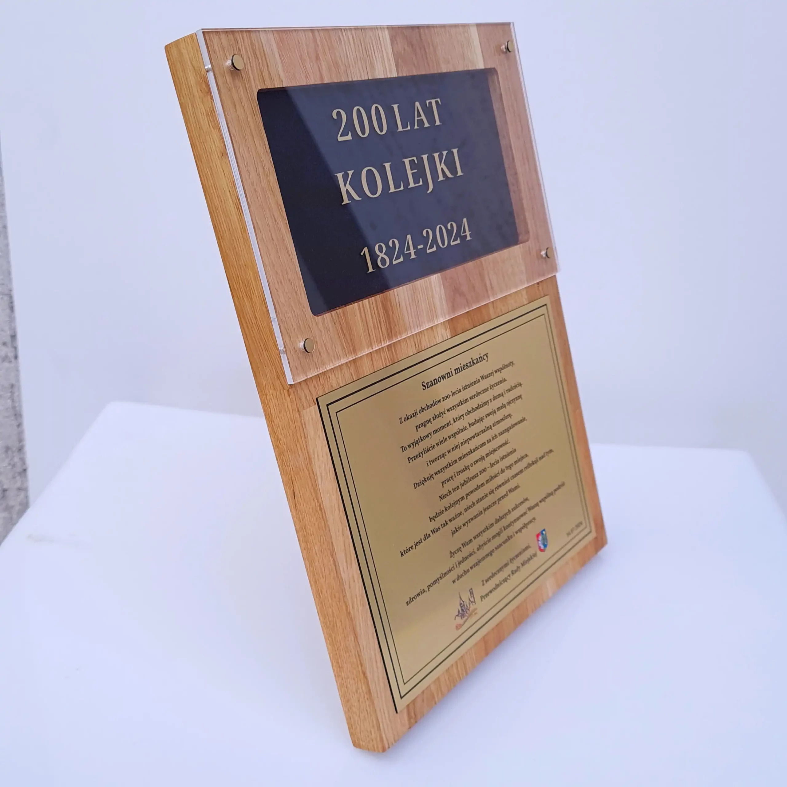 Wyjątkowe podziękowanie na drewnianym podkładzie z eleganckim, szczotkowanym złotym laminatem. Na laminacie znajduje się tekst, a specjalne miejsce na czarnym tle za bezbarwną pleksi pozwala na umieszczenie nazwy i tytułu uroczystości. Całość zapakowana w eleganckie etui, tworzy prestiżowy sposób na wyrażenie wdzięczności podczas najważniejszych wydarzeń.