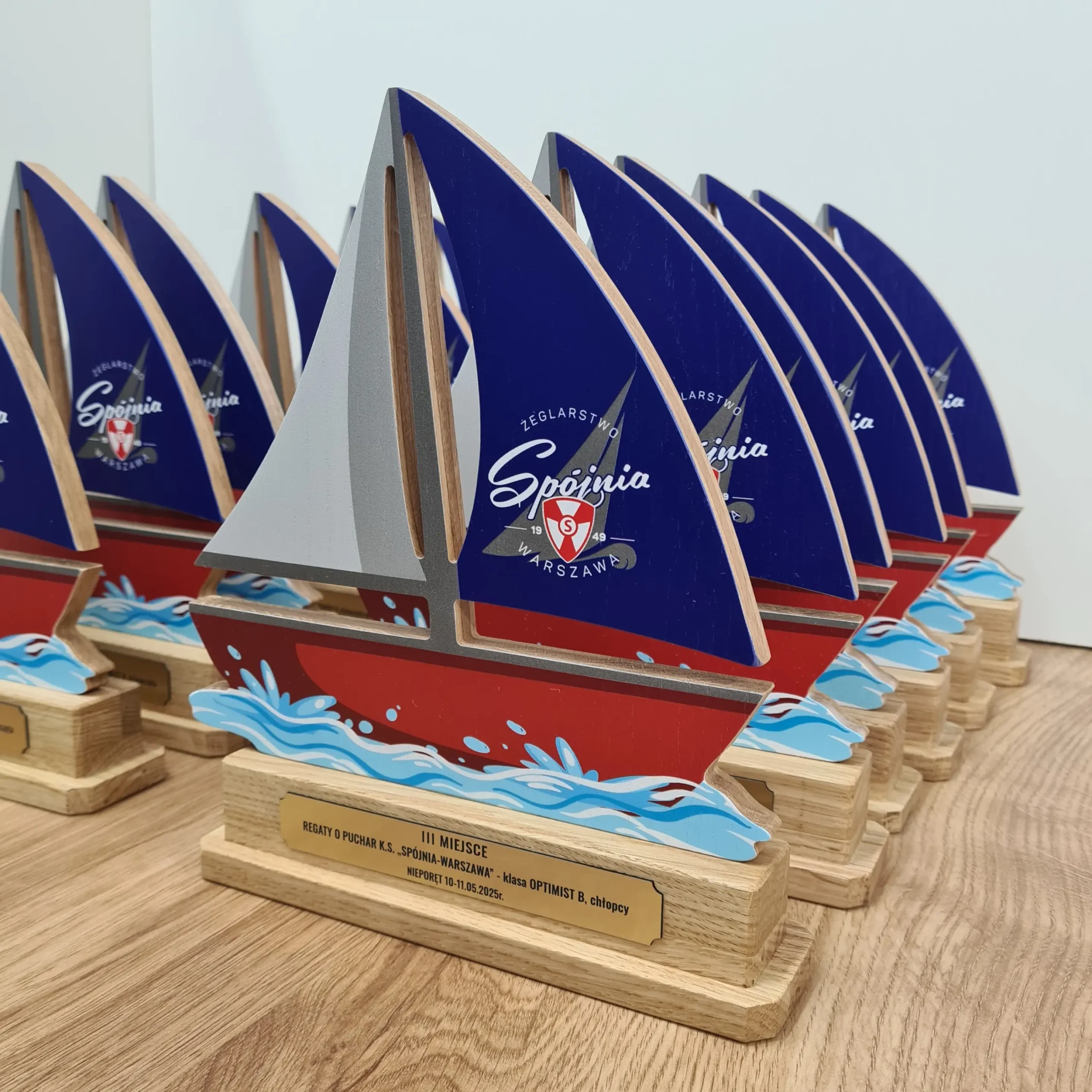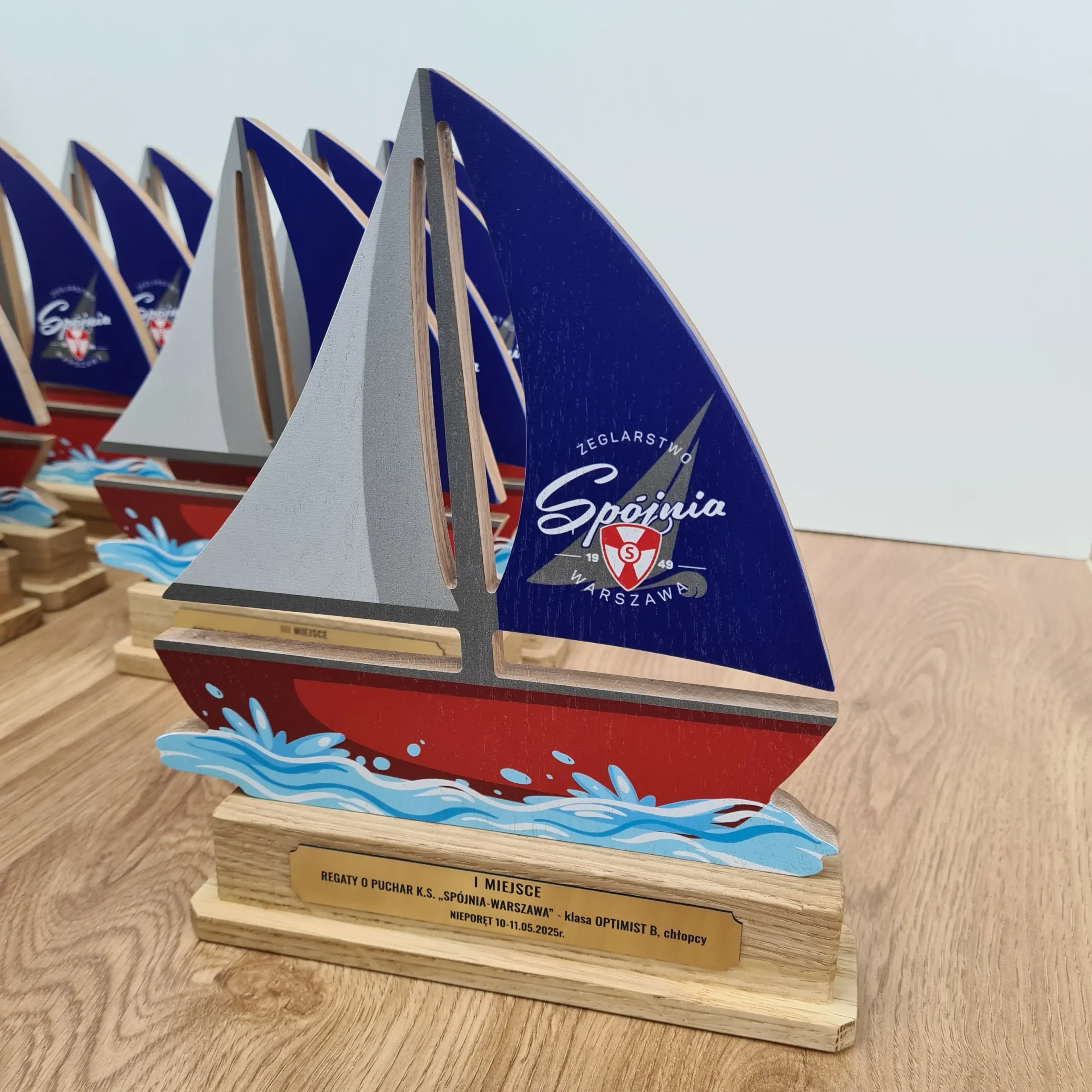Nowoczesna technologia druku UV pozwoliła oddać intensywne kolory i szczegóły logotypu, dzięki czemu statuetki prezentują się wyjątkowo efektownie i stanowią trwałą pamiątkę regat.