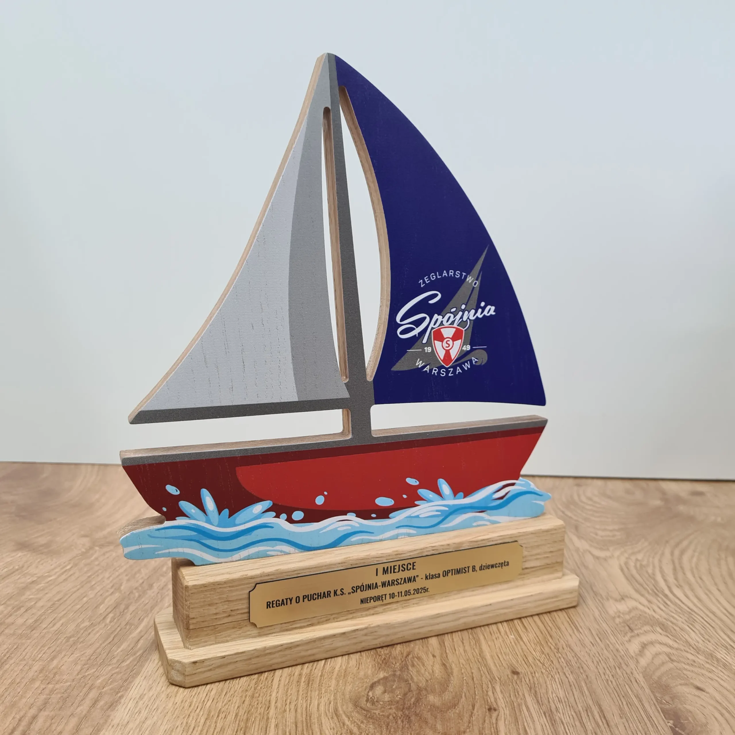Forma żaglówki z charakterystycznymi, barwnymi żaglami symbolizuje pasję, wolność i sportową rywalizację na wodzie. Motyw fal podkreśla żeglarski charakter wydarzenia, a grawerowana tabliczka z opisem miejsca i kategorii nadaje każdej statuetce indywidualny charakter.