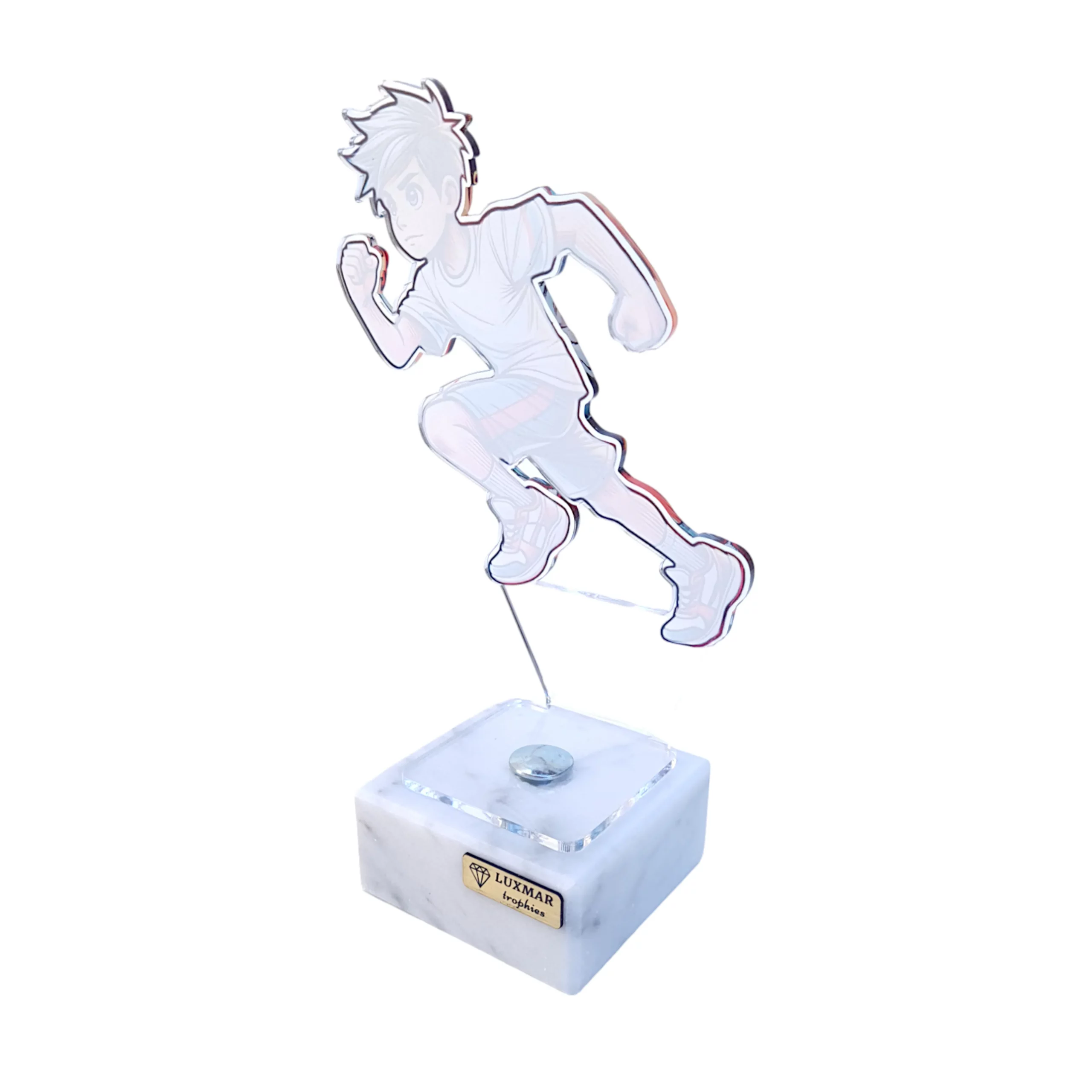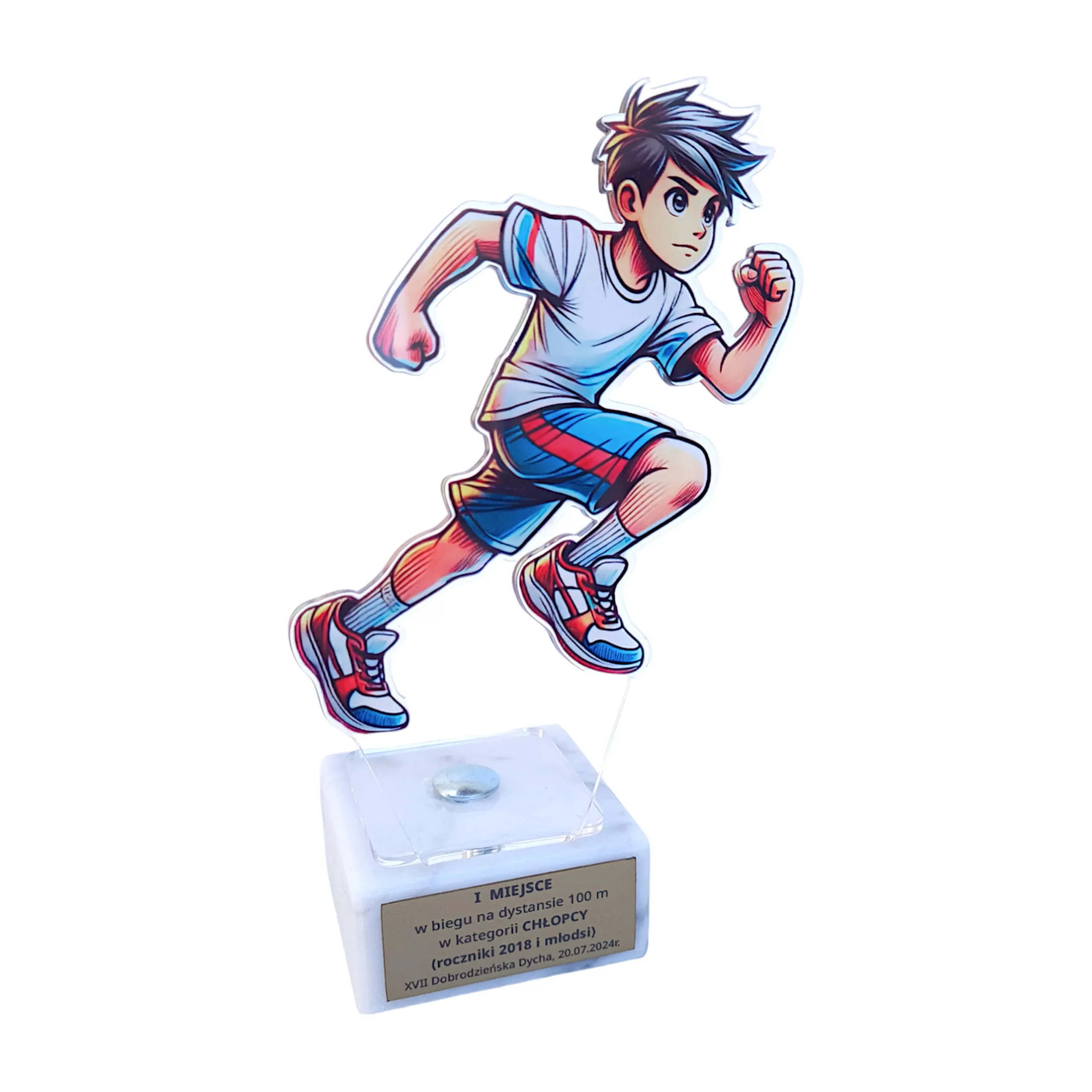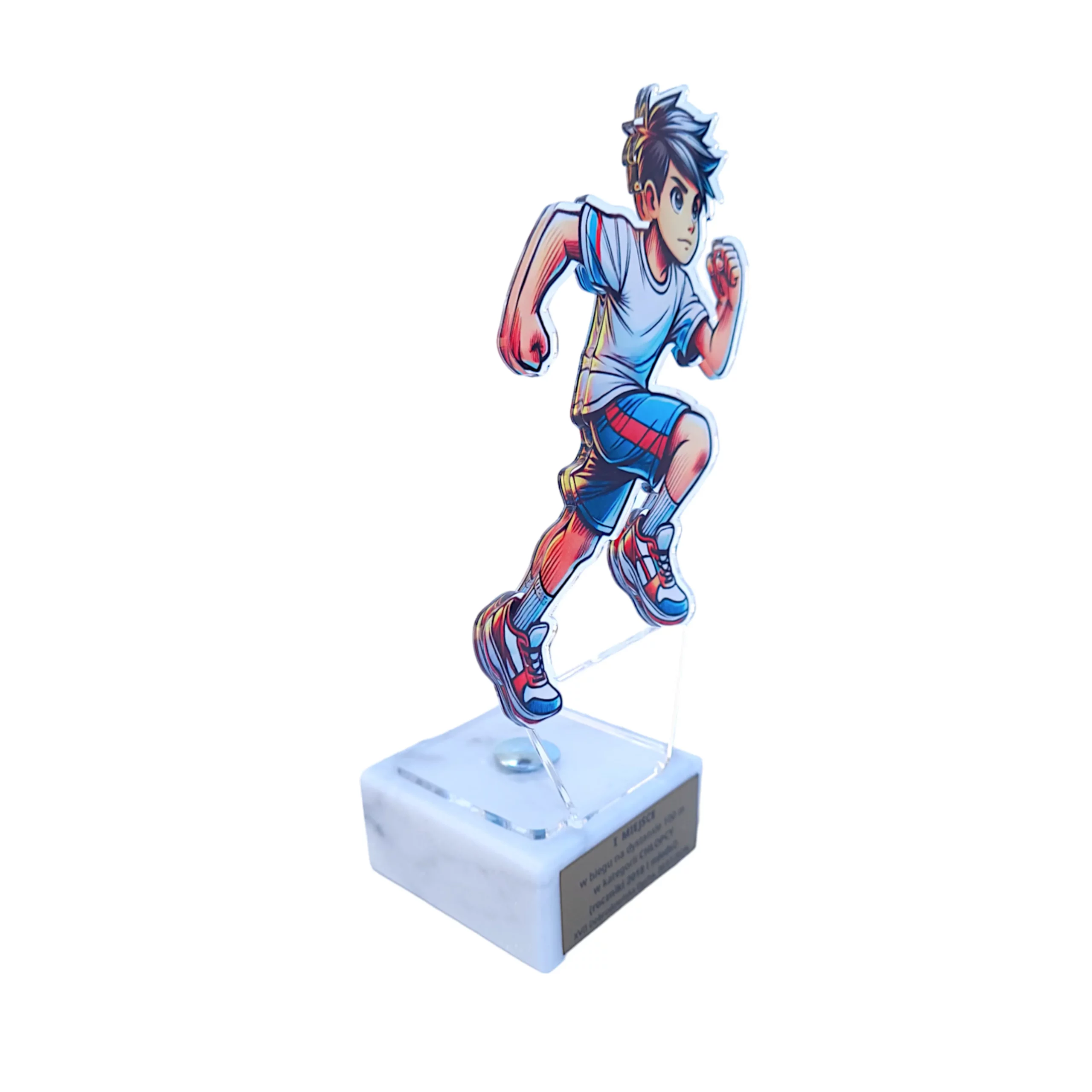 Stworzona z myślą o wyróżnieniu pasji, wytrwałości i osiągnięć sportowych. Elegancka i nowoczesna forma wykonana z bezbarwnej pleksi z nadrukowaną postacią biegacza stoi na solidnej kamiennej podstawie, która zawiera tabliczkę z personalizowanym grawerem, co czyni ją niepowtarzalną nagrodą.