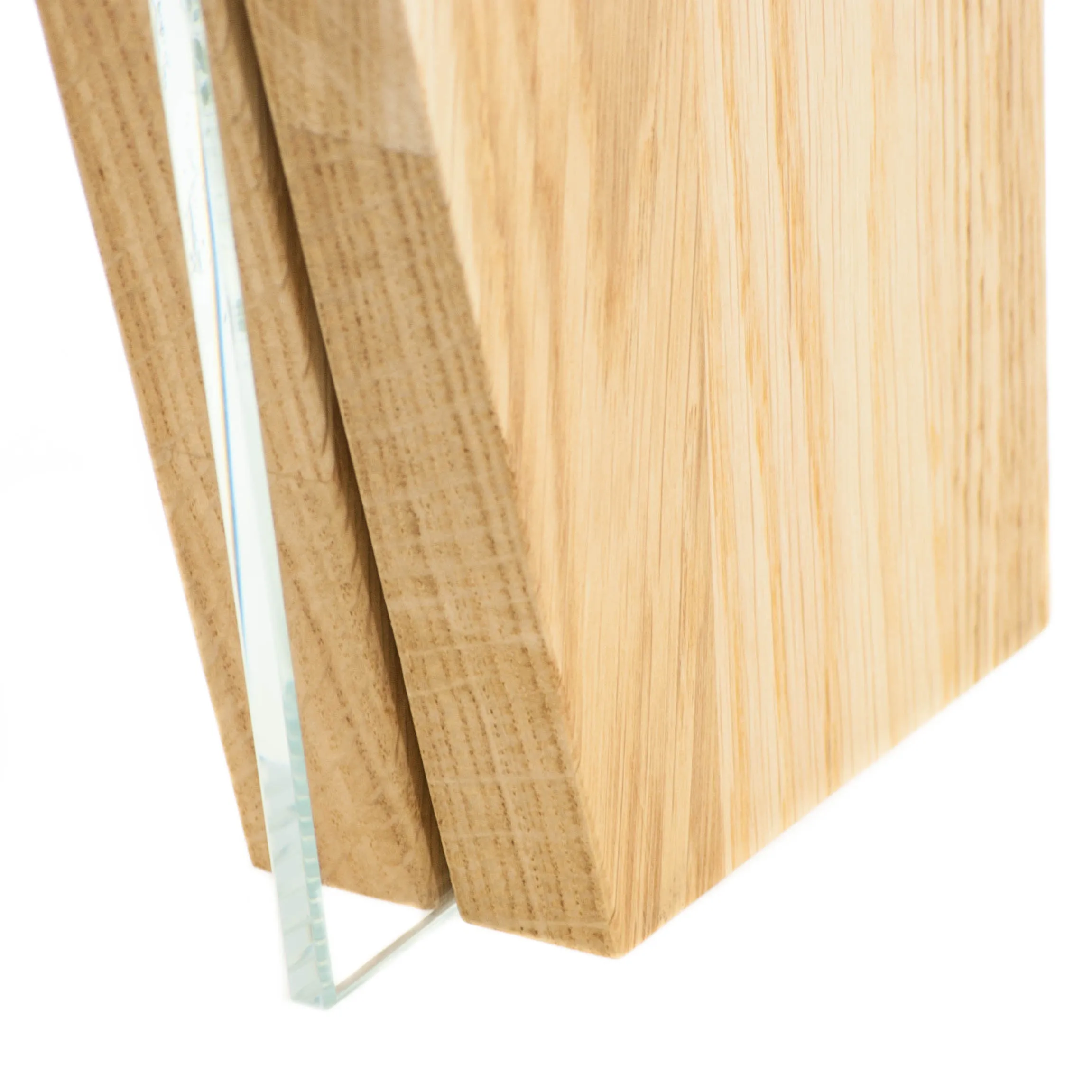 Połączenie szkła Optiwhite o grubości 6 mm z naturalnym drewnem dębowym daje efekt nowoczesnej lekkości i ponadczasowej klasy. Standardowy grawer zastąpiliśmy wysokiej jakości nadrukiem UV, który pozwala na pełną personalizację.