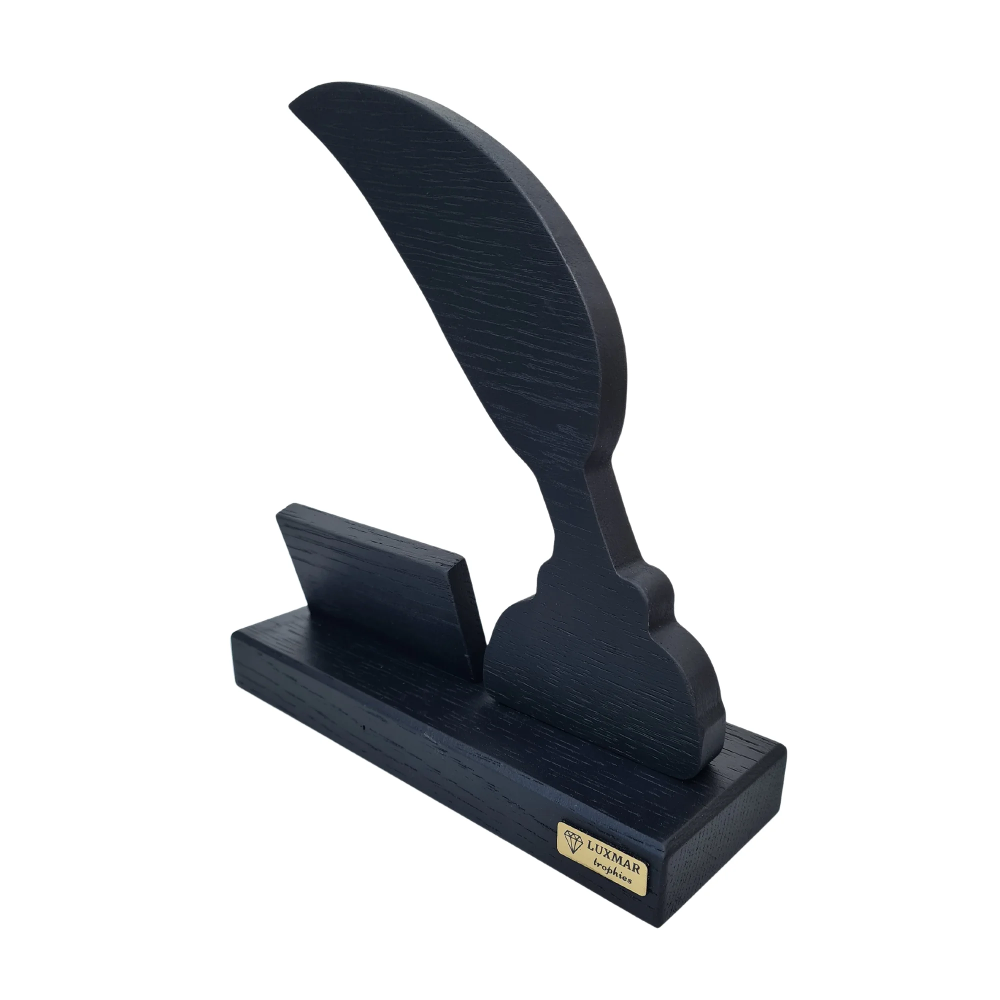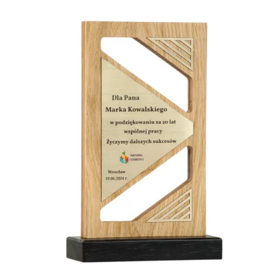 Z dębowego drewna najwyższej jakości powstała ta okolicznościowa statuetka pióro, ozdobiona złotym lustrzanym laminatem, co nadaje jej eleganckiego wyglądu. Grawerowane dane i dedykacja na małej tabliczce dodają osobistego charakteru, tworząc produkt niezwykle wartościowy dla obdarowywanej osoby.