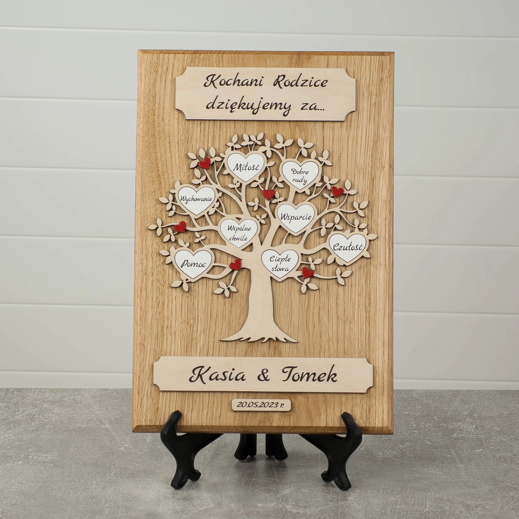 Produkt wykonany z najwyższej jakości naturalnego drewna dębowego. Idealnie sprawdzi się jako podziękowanie dla Rodziców za okazaną miłość oraz wparcie na każdym kroku.